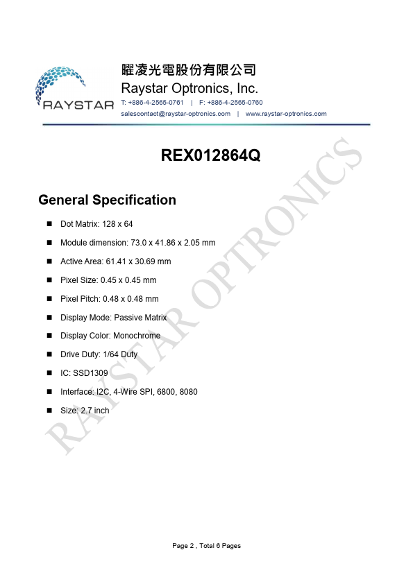 曜凌光電股份有限公司 Raystar Optronics, Inc. +886-4-2565-0760 salescontact@raystar-optronics. REX012864Q General Specification Dot Matrix:.