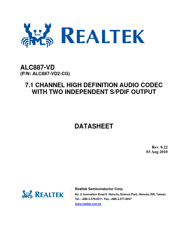 The ALC887-VD is a 7.1 Channel High Definition Audio Codec with two independent SPDIF outputs. Featuring eight DAC channels that simultaneously support 7.1 sound playback, and integrate two stereo ADCs that can support a stereo microphone, and feature Acoustic Echo Cancellation (AEC), Beam Forming (BF), and Noise Suppression (NS) for voice applications The ALC887-VD supports 16/20/24-bit SPDIF input and output functions with sampling rate of up to 192kHz, offering easy connection of PCs to high quality consumer electronic products such as digital decoders and Minidisk devices.