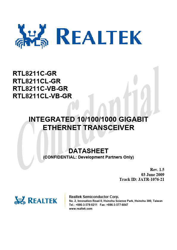 The Realtek RTL8211C(L)/RTL8211C(L)-VB is a highly integrated Ethernet transceiver that complies with 10Base-T, 100Base-TX, and 1000Base-T IEEE 802.3 standards. It provides all the necessary physical layer functions to transmit and receive Ethernet packets over CAT 5 UTP cable or CAT 3 UTP (10Mbps only) cable.