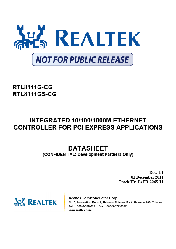 The Realtek RTL8111G-CG/RTL8111GS-CG 10/100/1000M Ethernet controller combines a triple-speed IEEE 802.3 compliant Media Access Controller (MAC) with a triple-speed Ethernet transceiver, PCI Express bus controller, and embedded memory. With state-of-the-art DSP technology and mixed-mode signal technology, the RTL8111G/RTL8111GS offers high-speed transmission over CAT 5 UTP cable or CAT 3 UTP (10Mbps only) cable.