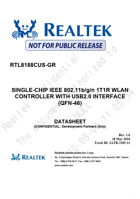 | Description | Single Chip IEEE 802.11b/g/n 1T1R WLAN Controller |