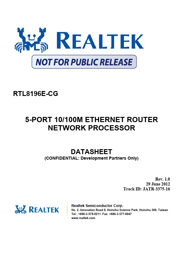 The RTL8196E-CG is an integrated System-on-a-Chip (SoC) Application Specific Integrated Circuit (ASIC) L2 5-Port Ethernet switch. An RLX4181 CPU is embedded and the clock rate can be up to 400MHz.