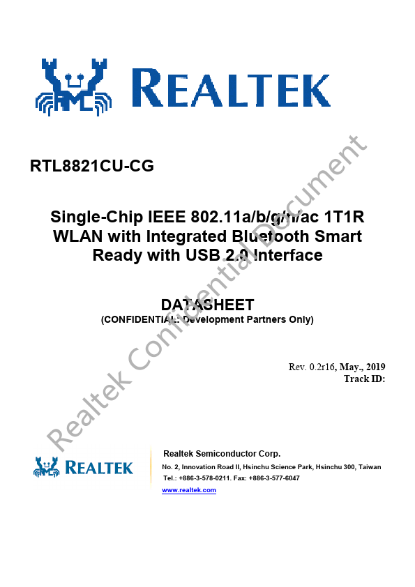 The Realtek RTL8821CU-CG is a highly-integrated IEEE 802.11 a/b/g/n/ac MAC/Baseband/RF WLAN and Bluetooth Baseband/RF single chip. For Wireless LAN (WLAN) operation, it supports 1-stream 802.11ac solution with Multi-user MIMO (Multiple-Input, Multiple-Output) STA mode with USB2.0 network interface controller.
