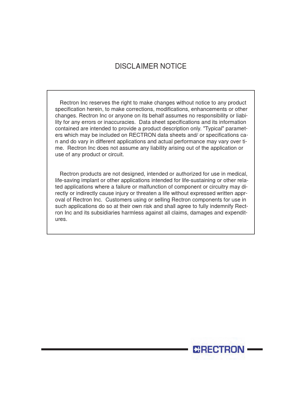 "Typical" parameters which may be included on RECTRON data sheets and/ or specifications can and do vary in different applications and actual performance may vary over time. Rectron Inc does not assume any liability arising out of the application or use of any product or circuit. Rectron products are not designed, intended or authorized for use in medical, life-saving implant or other applications intended for...