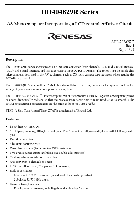 The HD404829R series incorporates an 8-bit A/D converter (four channels), a Liquid Crystal Display (LCD) and a serial interface, and has large-current Input/Output (I/O) pins. The series is a 4-bit single-chip microcomputer best used in the AV equipment such as CD radio cassette tape recorders which require the LCD display control.