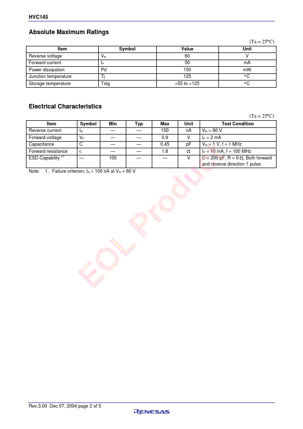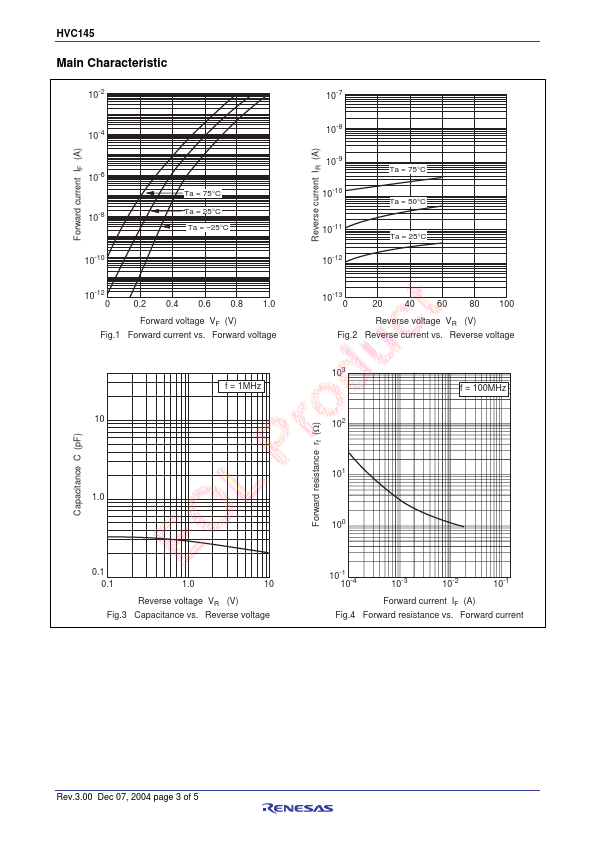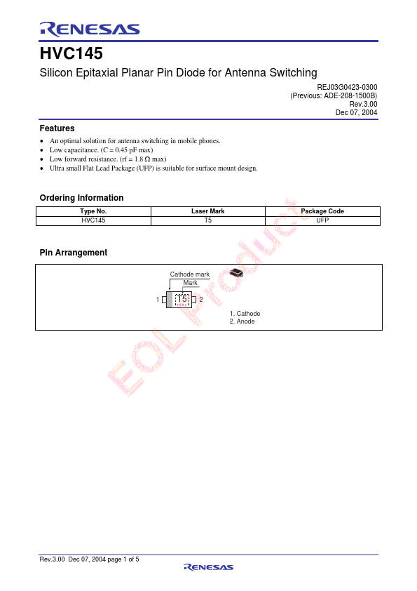 HVC145 Silicon Epitaxial Planar Pin Diode for Antenna Switching REJ03G0423-0300 (Previous: ADE-208-1500B) Rev.3.00 Dec 07, 2004.