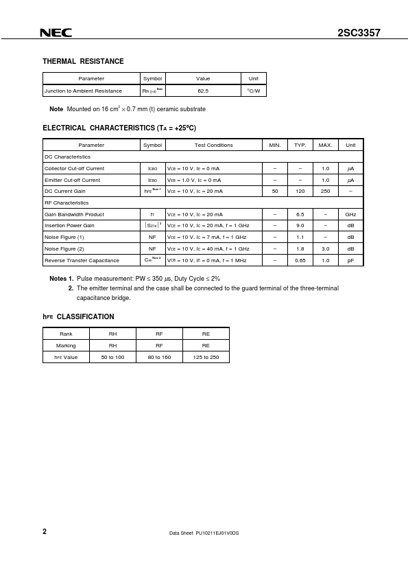 Overview: DATA SHEET NPN SILICON RF TRANSISTOR 2SC3357 NPN EPITAXIAL SILICON RF TRANSISTOR FOR HIGH-FREQUENCY LOW-NOISE AMPLIFICATION 3-PIN POWER.