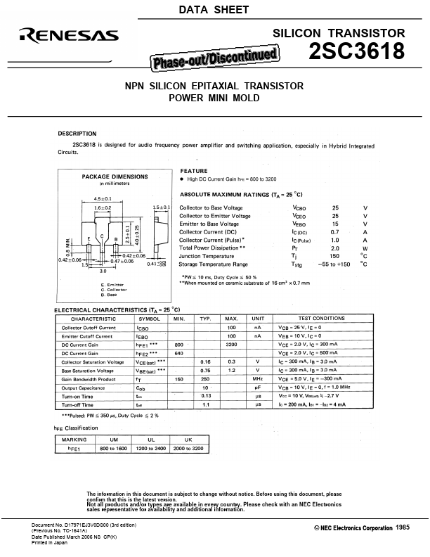 2SC3618 NPN SILICON EPITAXIAL TRANSISTOR POWER MINI MOLD The information in this document is subject to change without notice. Before using this document, please