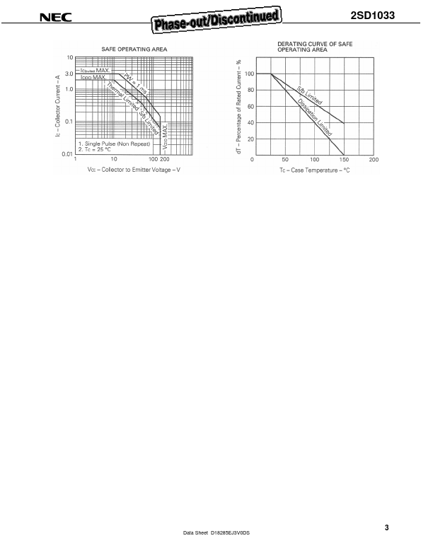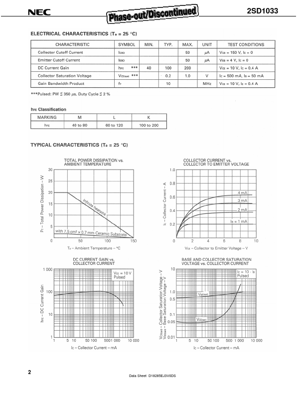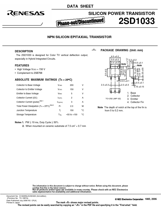 DATA SHEET SILICON POWER TRANSISTOR 2SD1033 NPN SILICON EPITAXIAL TRANSISTOR DESCRIPTION The 2SD1033 is designed for Color TV vertical deflection output, especially in Hy...