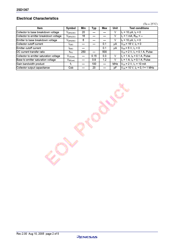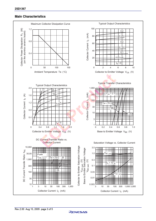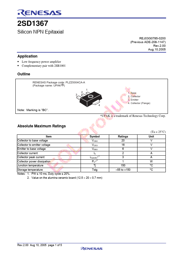 2SD1367 Silicon NPN Epitaxial Application • Low frequency power amplifier • Complementary pair with 2SB1001 Outline RENESAS Package code: PLZZ0004CA-A (Package name: UPAK R ) 1 2 3 Note: Marking is.