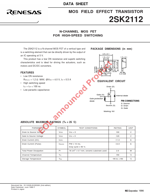 RDS(on) = 1.2 Ω MAX. @VGS = 4.0 V, ID = 0.5 A • High switching speed