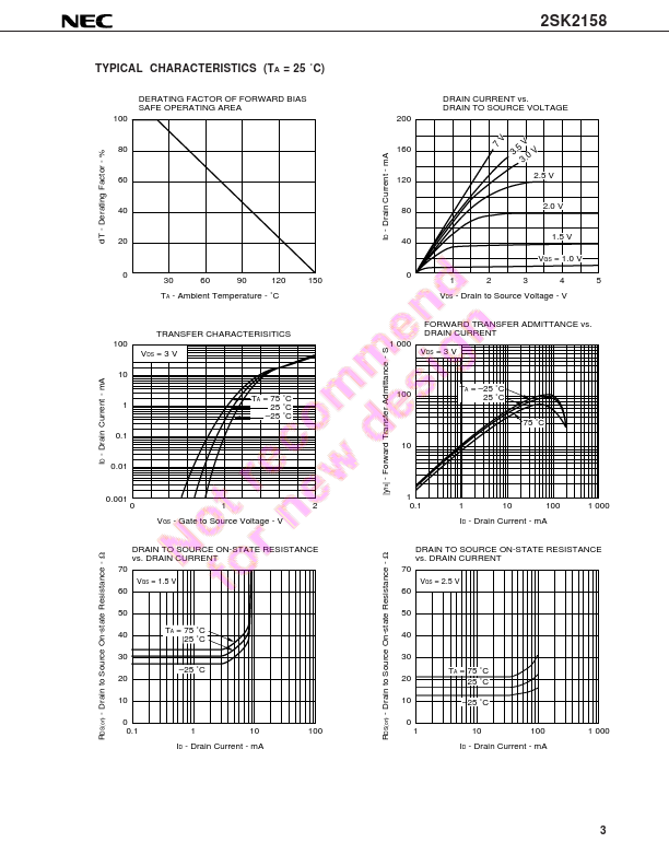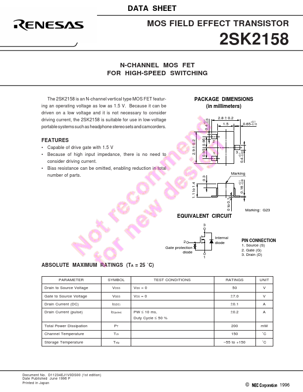 The 2SK2158 is an N-channel vertical type MOS FET featuring an operating voltage as low as 1.5 V. Because it can be driven on a low voltage and it is not necessary to consider driving current, the 2SK2158 is suitable for use in low-voltage portable systems such as headphone stereo sets and camcorders.