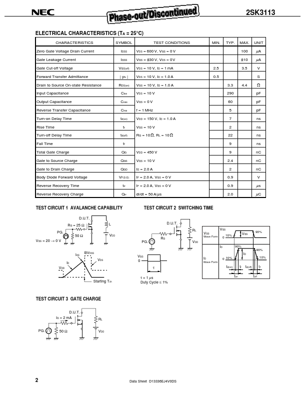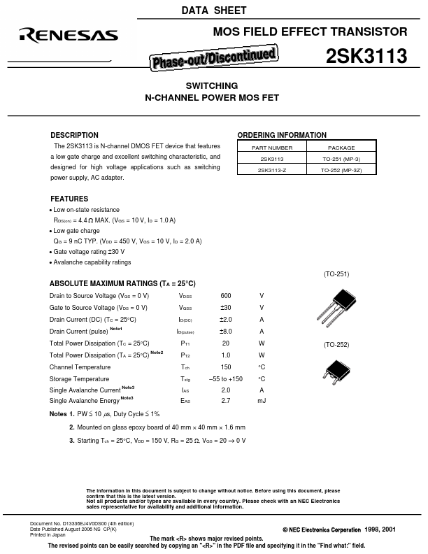 The 2SK3113 is N-channel DMOS FET device that features a low gate charge and excellent switching characteristic, and designed for high voltage applications such as switching power supply, AC adapter.