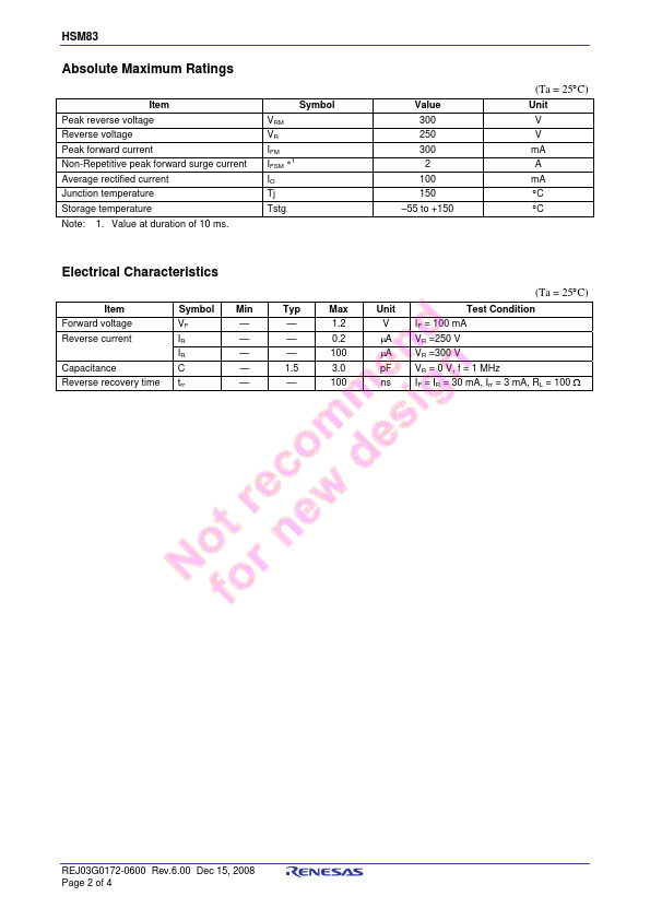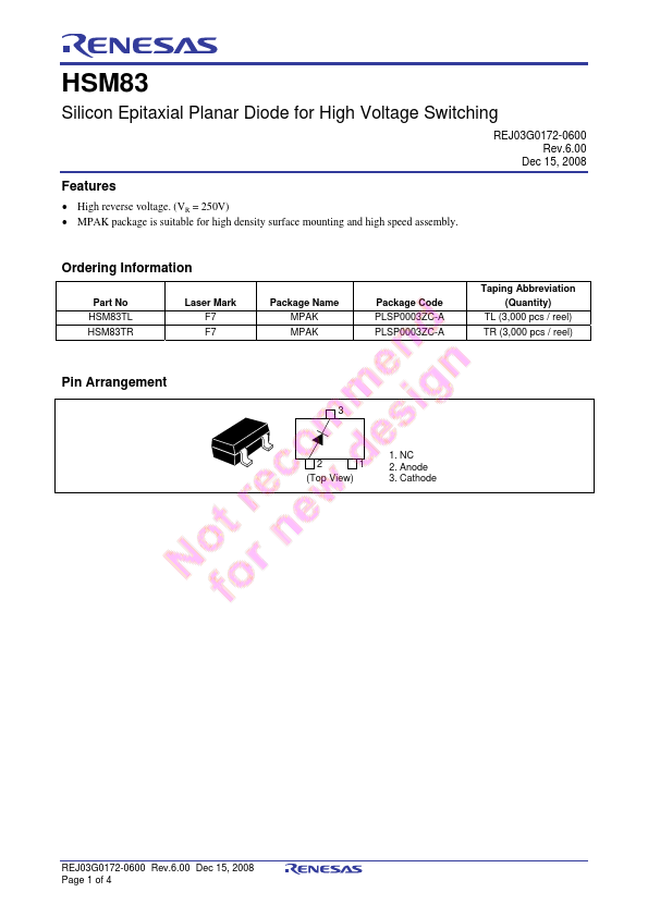 HSM83 Silicon Epitaxial Planar Diode for High Voltage Switching REJ03G0172-0600 Rev.6.00 Dec 15, 2008.