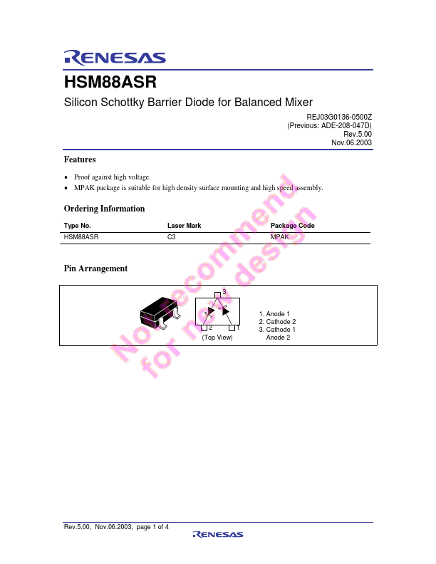 Overview: HSM88ASR Silicon Schottky Barrier Diode for Balanced Mixer REJ03G0136-0500Z (Previous: ADE-208-047D) Rev.5.00 Nov.06.