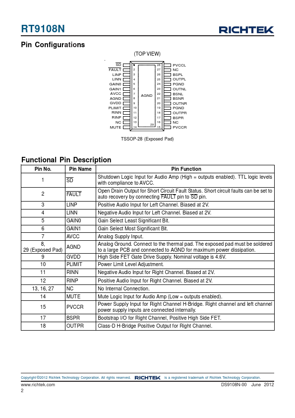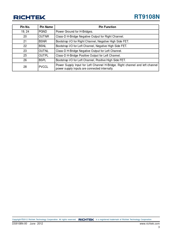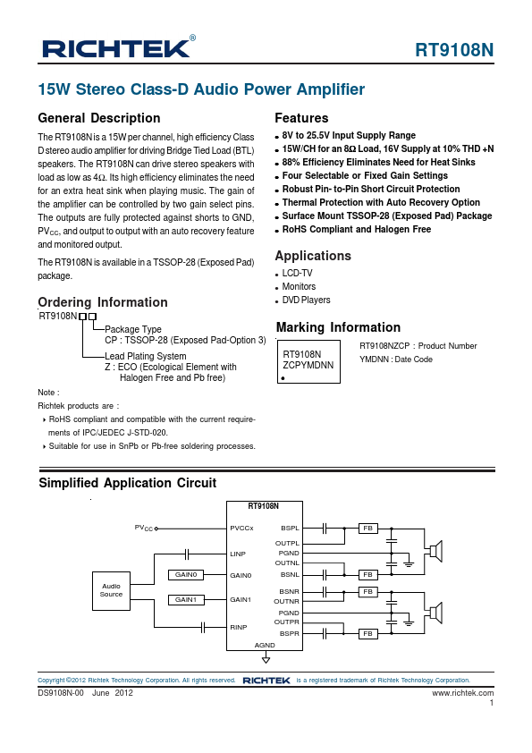 Features The RT9108N is a 15W per channel, high efficiency Class D stereo audio amplifier for driving Bridge Tied Load (BTL) speakers. The RT9108N can drive stereo speakers with load as low as 4Ω. Its high efficiency eliminates the need for an extra heat sink when playing music.