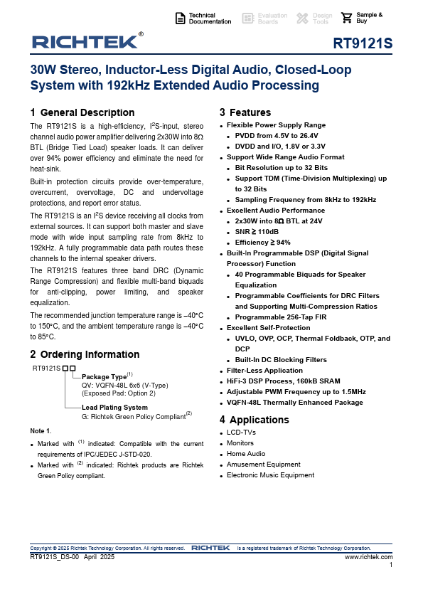RT9121S is 30W Stereo Digital Audio Closed-Loop System manufactured by Richiek.