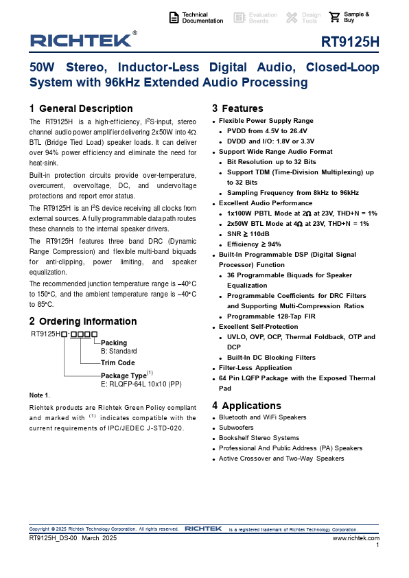 The RT9125H is a high-ef f iciency, I2S-input, stereo channel audio power amplif ier delivering 2x50W into 4 BTL (Bridge Tied Load) speaker loads. It can deliver over 94% power ef f iciency and eliminate the need for heat-sink.