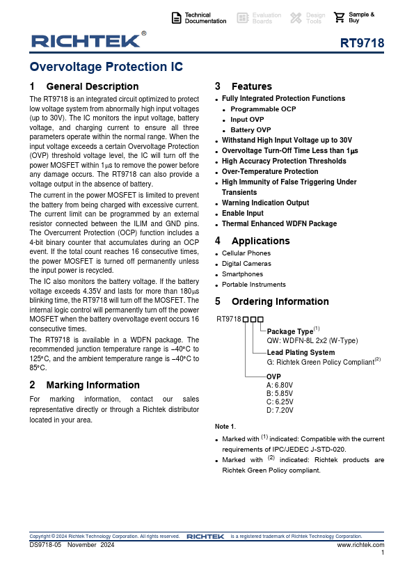 The RT9718 is an integrated circuit optimized to protect low voltage system from abnormally high input voltages (up to 30V). The IC monitors the input voltage, battery voltage, and charging current to ensure all three parameters operate within the normal range. When the input voltage exceeds a certain Overvoltage Protection (OVP) threshold voltage level, the IC will turn off the power MOSFET within 1s to remove the power before any damage occurs. The RT9718 can also provide a voltage output in the absence of battery.