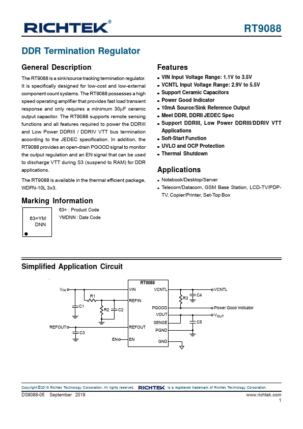 The RT9088 is a sink/source tracking termination regulator. It is specifically designed for low-cost and low-external component count systems.