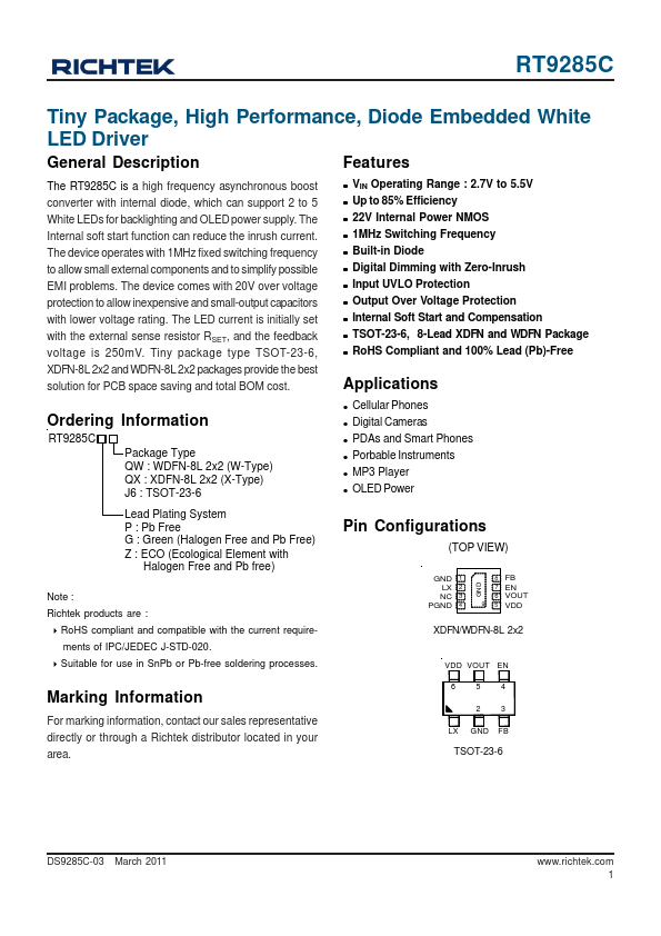 The RT9285C is a high frequency asynchronous boost converter with internal diode, which can support 2 to 5 White LEDs for backlighting and OLED power supply. The Internal soft start function can reduce the inrush current. The device operates with 1MHz fixed switching frequency to allow small external ponents and to simplify possible EMI problems. The device es with 20V over voltage protection to allow inexpensive and small-output capacitors with lower voltage rating. The LED current is initially set with the external sense resistor RSET, and the feedback voltage is 250m V. Tiny package type TSOT-23-6, XDFN-8L 2x2 and WDFN-8L 2x2 packages provide the best solution for PCB space saving and total BOM cost.