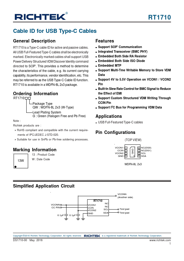 RT1710 is a Type-C cable ID for active and passive cables. All USB Full-Featured Type-C cables shall be electronically marked.