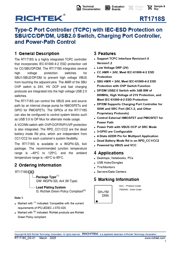 The RT1718S is a highly integrated TCPC controller that incorporates IEC-61000-4-2 ESD protection cell for CC/SBU/DP/DM. The RT1718S integrates several high voltage protection switches for SBU1/SBU2/DP/DM to prevent high voltage VBUS from touching the adjacent pins.
