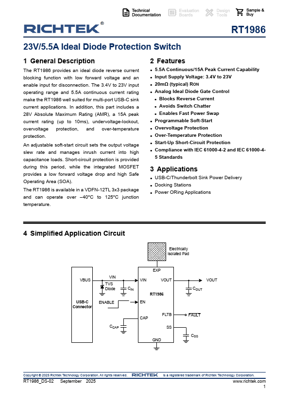 RT1986 is 23V/5.5A Ideal Diode Protection Switch manufactured by Richtek.
