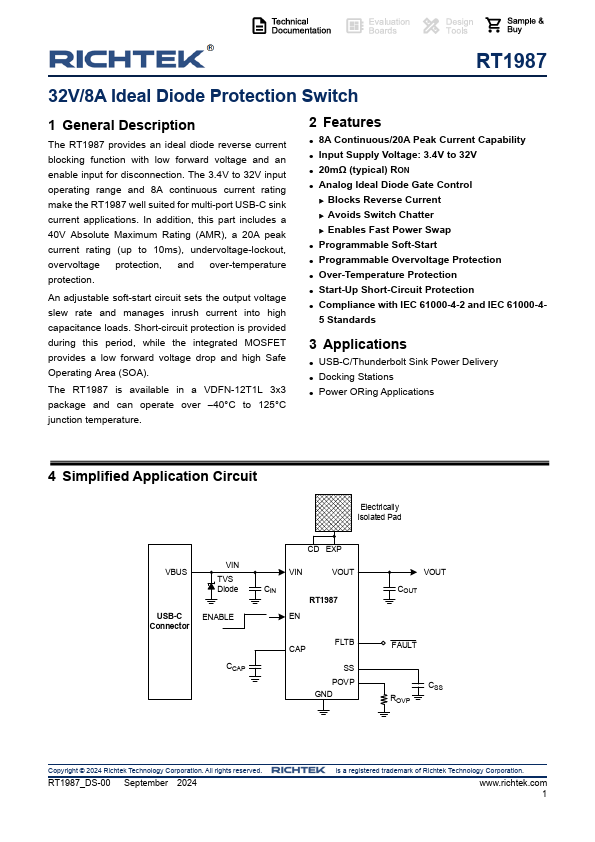 RT1987 is 32V/8A Ideal Diode Protection Switch manufactured by Richtek.