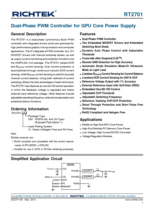 The RT2701 is a dual-phase synchronous Buck PWM controller with integrated drivers which are optimized for high performance graphic microprocessor and puter applications. The IC integrates a PWM controller, two 12V MOSFET drivers with internal bootstrap diodes, as well as output current monitoring and protection functions into the WQFN-24L 4x4 package. The RT2701 adopts DCR and RDS(ON) current sensing. Over current protection is acplished through continuous inductor DCR current sensing, while RDS(ON) current sensing is used for accurate channel current balance. Using both methods of current sampling utilizes the best advantages of each technique. The RT2701 also Features an one-bit VID control operation in which the feedback voltage is regulated and tracks external input reference voltage. Other Features include adjustable operating frequency, external pensation and enable/shutdown functions.
