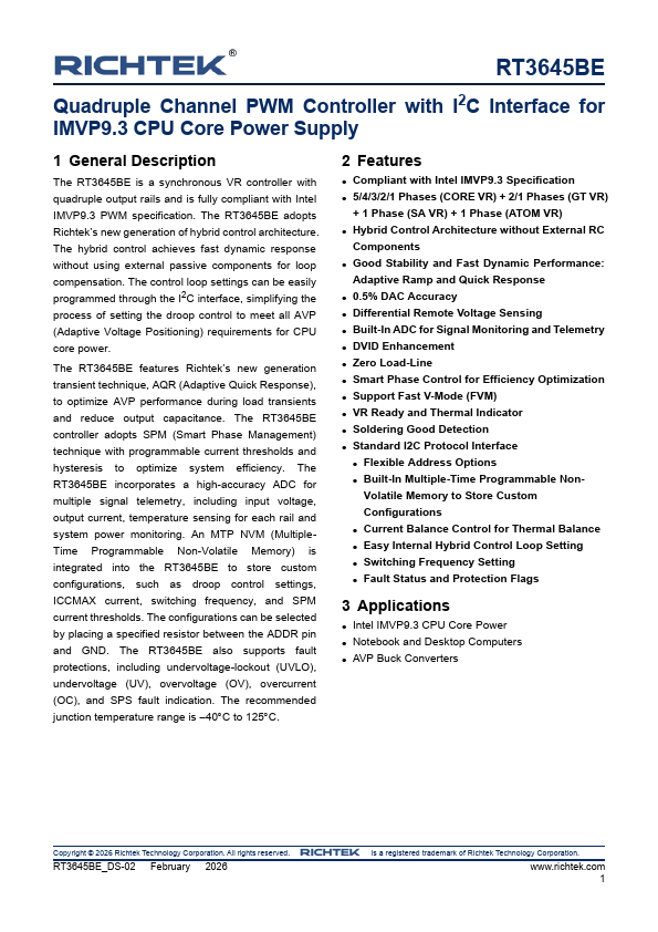 The RT3645BE is a synchronous VR controller with quadruple output rails and is fully pliant with Intel IMVP9.3 PWM specification. The RT3645BE adopts Richtek’s new generation of hybrid control architecture. The hybrid control achieves fast dynamic response without using external passive ponents for loop pensation.