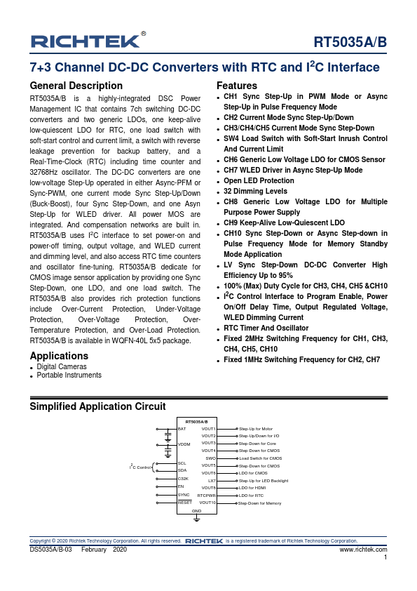 RT5035A/B is a highly-integrated DSC Power Management IC that contains 7ch switching DC-DC converters and two generic LDOs, one keep-alive low-quiescent LDO for RTC, one load switch with soft-start control and current limit, a switch with reverse leakage prevention for backup battery, and a Real-Time-Clock (RTC) including time counter and 32768Hz oscillator. The DC-DC converters are one low-voltage Step-Up operated in either Async-PFM or Sync-PWM, one current mode Sync Step-Up/Down (Buck-Boost), four Sync Step-Down, and one Asyn Step-Up for WLED driver. All power MOS are integrated. And pensation networks are built in. RT5035A/B uses I2C interface to set power-on and power-off timing, output voltage, and WLED current and dimming level, and also access RTC time counters and oscillator fine-tuning. RT5035A/B dedicate for CMOS image sensor application by providing one Sync Step-Down, one LDO, and one load switch. The RT5035A/B also provides rich protection functions include Over-Current Protection, Under-Voltage Protection, Over-Voltage Protection, Over Temperature Protection, and Over-Load Protection. RT5035A/B is available in WQFN-40L 5x5 package.