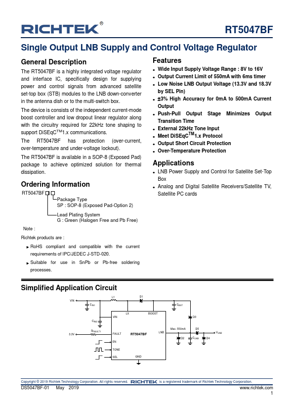 RT5047BF is Single Output LNB Supply and Control Voltage Regulator manufactured by Richtek.