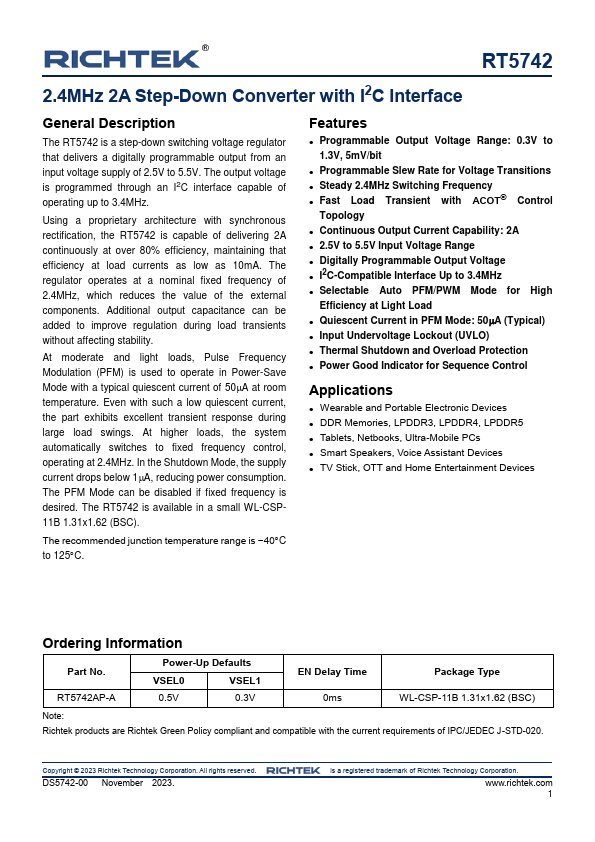The RT5742 is a step-down switching voltage regulator that delivers a digitally programmable output from an input voltage supply of 2.5V to 5.5V. The output voltage is programmed through an I2C interface capable of operating up to 3.4MHz.