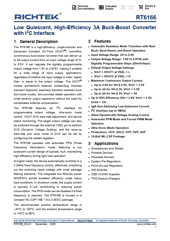 The RT6166 is a high-efficiency, single-inductor and Advanced Constant On-Time (ACOT® ) monolithic synchronous buck-boost converter that can deliver up to 3A output current from an input voltage range of 2V to 5.5V. It can regulate the digitally programmable output voltage from 1.8V to 4.975V, making it suitable for a wide range of input supply applications, regardless of whether the input voltage is lower, higher than, or equal to the output voltage. The ACOT® control architecture features outstanding line/load transient response, seamless transition between buck and boost modes, and provides stable operation with small ceramic output capacitors without the need for plicated external pensation. The RT6166 features an I2C interface for programmable output voltage, ultra-sonic mode control, VOUT DVS slew-rate adjustment, and device status monitoring. The target output voltage can also be switched through the external VSEL pin to perform DVS (Dynamic Voltage Scaling), and the ramp-up slew-rate and ramp mode of DVS can be set by configuring the related registers.