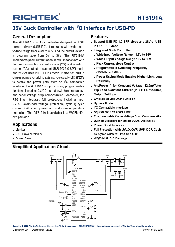 The RT6191A is a Buck controller designed for USB power delivery (USB PD). It operates with wide input voltage range from 4.5V to 36V, and the output voltage is programmable from 3V to 36V. The RT6191A implements peak current mode control mechanism with the programmable constant voltage (CV) and constant current (CC) output to support USB-PD 3.0 SPR mode and 28V of USB-PD 3.1 EPR mode. It also has built-in charge pumps for driving external low-cost N-MOSFETs to control the power path. With an I2C patible interface, the RT6191A supports many programmable functions including CV/CC output, switching frequency, and cable voltage drop pensation. Moreover, the RT6191A integrates full protections including input UVLO, over/under-voltage protection, cycle-by-cycle current limit, short protection, and over-temperature protection. The RT6191A is available in a WQFN-40L 5x5 package.