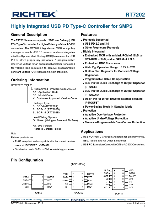 ® RT7202 Highly Integrated USB PD Type-C Controller for SMPS General Description Features The RT7202 is a secondary-side USB Power Delivery (USB PD) Type-C controller for high-efficiency off-line ...