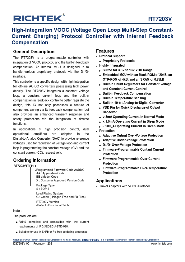 The RT7203V is a programmable controller with integration of VOOC protocol, and the built-in feedback compensation. An internal MCU is designed in to handle various proprietary protocols via the D+/Dinterface.