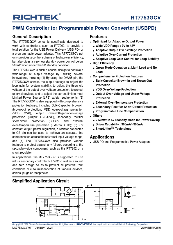 The RT7753GCV series is specifically designed to work with controllers, such as RT7202, to provide a total solution for the USB Power Delivery (USB PD) or a programmable power adapter. This RT7753GCV not only provides a control scheme of high power efficiency, but also gives a very low standby power control below 50mW when under the 5V standby condition. The RT7753GCV is such a special design to achieve a wide-range...