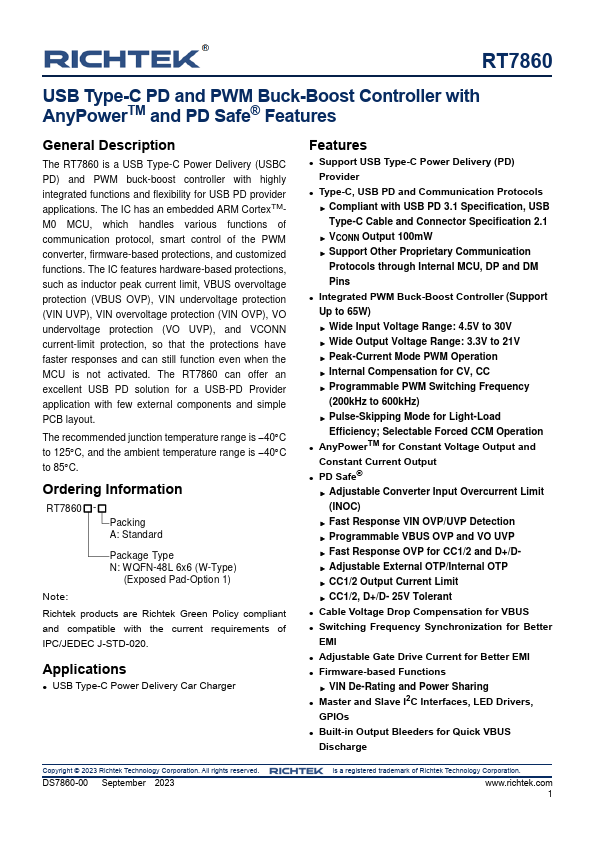 The RT7860 is a USB Type-C Power Delivery (USBC PD) and PWM buck-boost controller with highly integrated functions and flexibility for USB PD provider applications. The IC has an embedded ARM CortexTMM0 MCU, which handles various functions of communication protocol, smart control of the PWM converter, firmware-based protections, and customized functions.