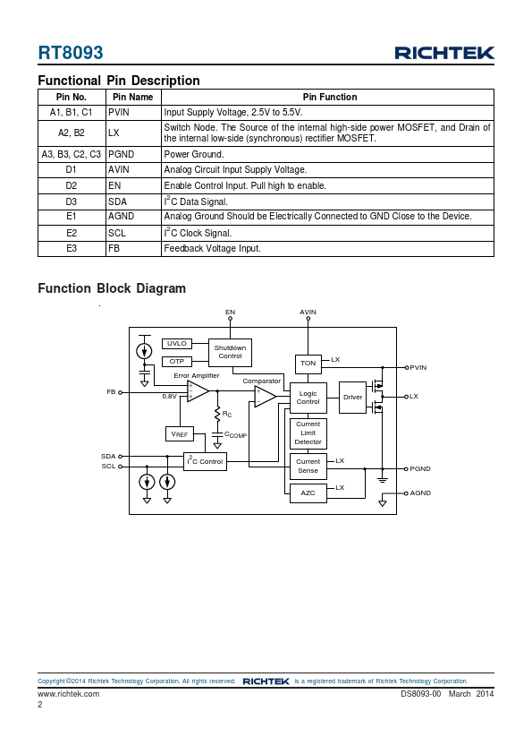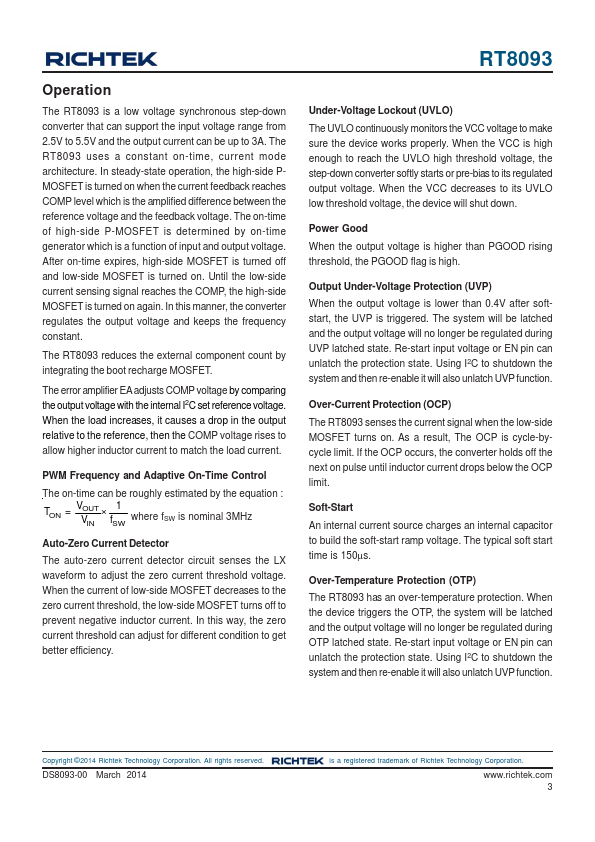 The RT8093 is a full featured 5.5V, 3A, Constant-On-Time (COT) synchronous step-down converter with two integrated MOSFETs.