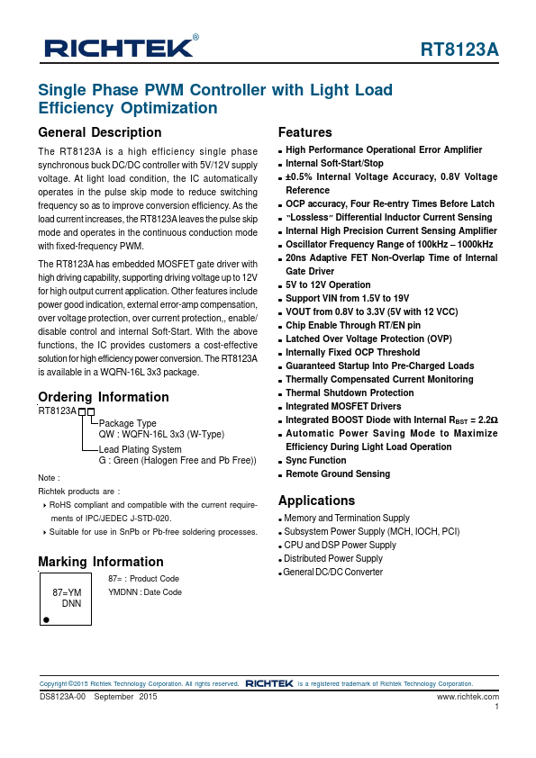 The RT8123A is a high efficiency single phase synchronous buck DC/DC controller with 5V/12V supply voltage. At light load condition, the IC automatically operates in the pulse skip mode to reduce switching frequency so as to improve conversion efficiency. As the load current increases, the RT8123A leaves the pulse skip mode and operates in the continuous conduction mode with fixed-frequency PWM.