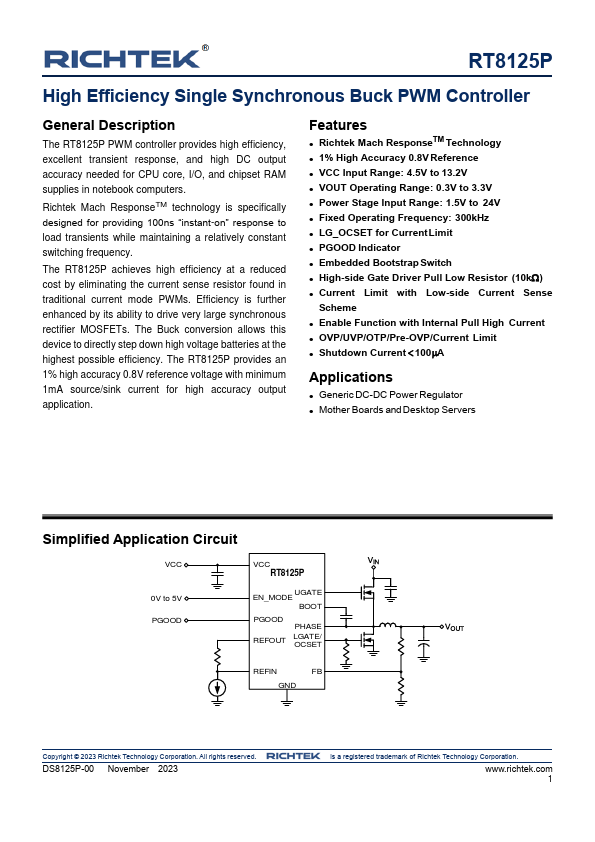 RT8125P is High Efficiency Single Synchronous Buck PWM Controller manufactured by Richtek.