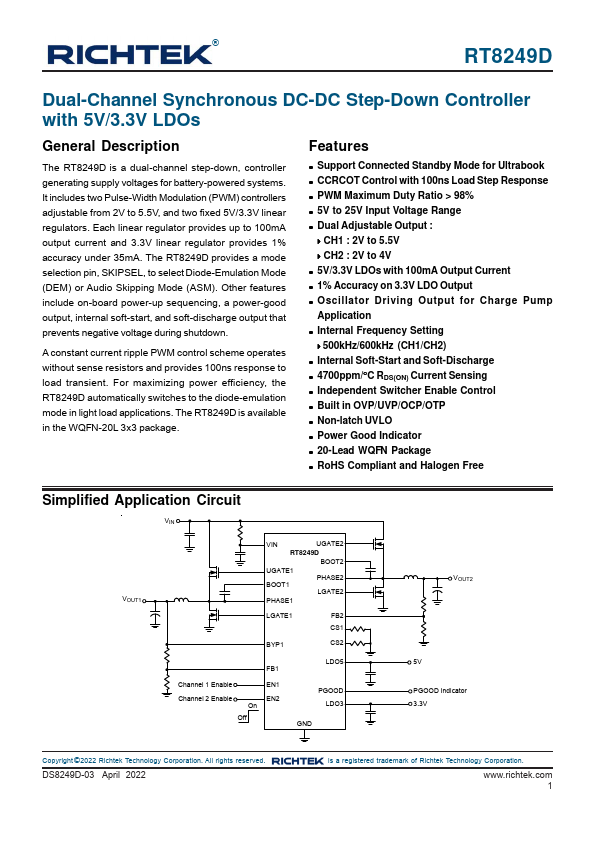 The RT8249D is a dual-channel step-down, controller generating supply voltages for battery-powered systems. It includes two Pulse-Width Modulation (PWM) controllers adjustable from 2V to 5.5V, and two fixed 5V/3.3V linear regulators.