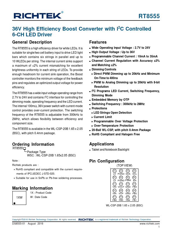RT8555 is 36V High Efficiency Boost Converter manufactured by Richtek.