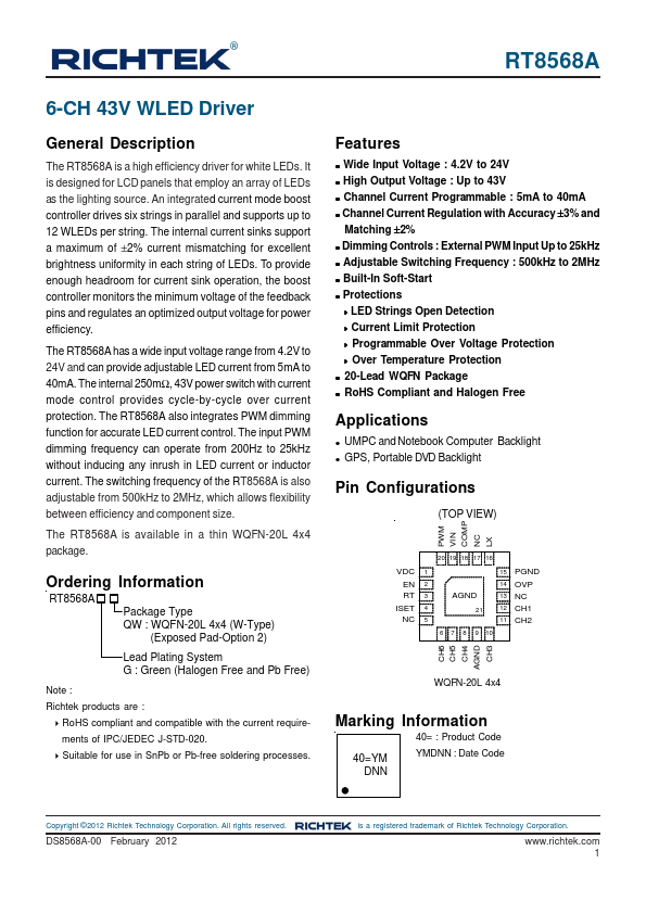 The RT8568A is a high efficiency driver for white LEDs. It is designed for LCD panels that employ an array of LEDs as the lighting source. An integrated current mode boost controller drives six strings in parallel and supports up to 12 WLEDs per string. The internal current sinks support a maximum of ±2% current mismatching for excellent brightness uniformity in each string of LEDs. To provide enough headroom for current sink operation, the boost controller monitors the minimum voltage of the feedback pins and regulates an optimized output voltage for power efficiency.
