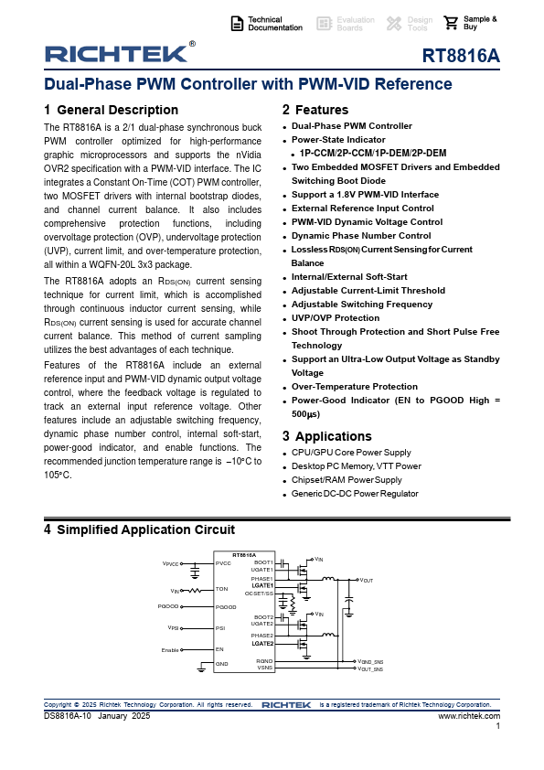 The RT8816A is a 2/1 dual-phase synchronous buck PWM controller optimized for high-performance graphic microprocessors and supports the nVidia OVR2 specification with a PWM-VID interface. The IC integrates a Constant On-Time (COT) PWM controller, two MOSFET drivers with internal bootstrap diodes, and channel current balance.