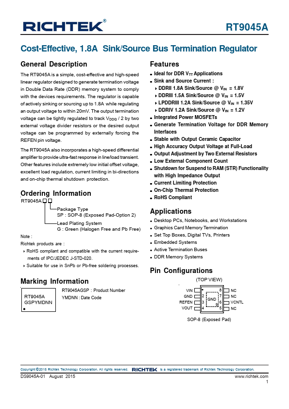 The RT9045A is a simple, cost-effective and high-speed linear regulator designed to generate termination voltage in Double Data Rate (DDR) memory system to ply with the devices requirements. The regulator is capable of actively sinking or sourcing up to 1.8A while regulating an output voltage to within 20mV. The output termination voltage can be tightly regulated to track VDDQ / 2 by two external voltage divider resistors or the desired output voltage can be programmed by externally forcing the REFEN pin voltage.