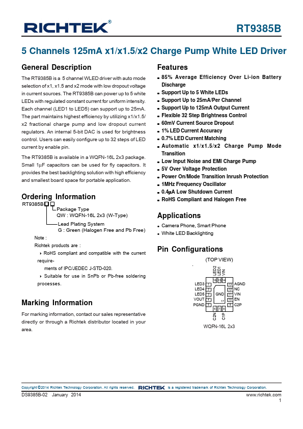 RT9385B is 5 Channels 125mA x1/x1.5/x2 Charge Pump White LED Driver manufactured by Richtek.