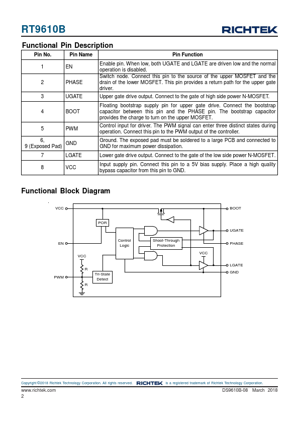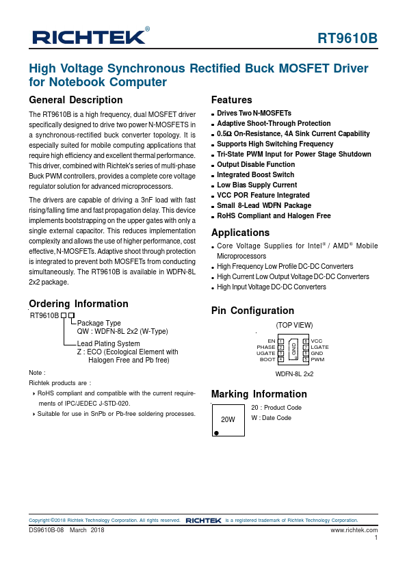 The RT9610B is a high frequency, dual MOSFET driver specifically designed to drive two power N-MOSFETS in a synchronous-rectified buck converter topology. It is especially suited for mobile puting applications that require high efficiency and excellent thermal performance. This driver, bined with Richtek's series of multi-phase Buck PWM controllers, provides a plete core voltage regulator solution for advanced microprocessors.